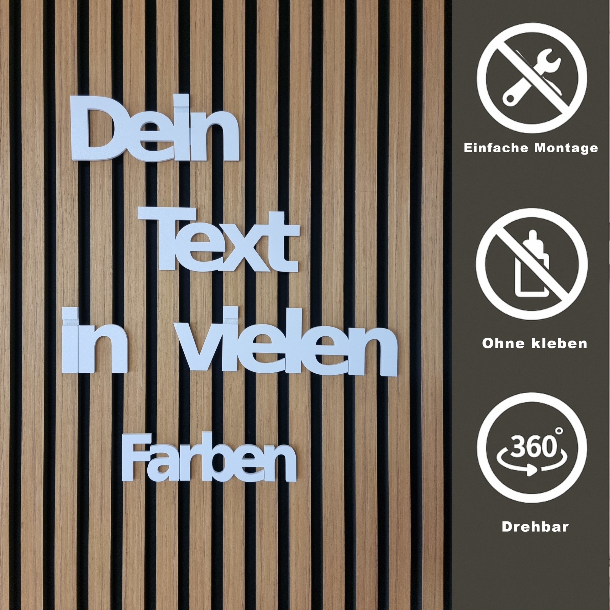 Unser personalisierbarer 3D-Schriftzug wird aus widerstandsfähigem PETG im FDM-3D-Druck gefertigt. Auf der Rückseite sitzt ein runder Zapfen, auf den der mitgelieferte Clip gesteckt wird. Da der Zapfen rund ist, kannst du das Wort 360° frei drehen und jederzeit neu ausrichten.