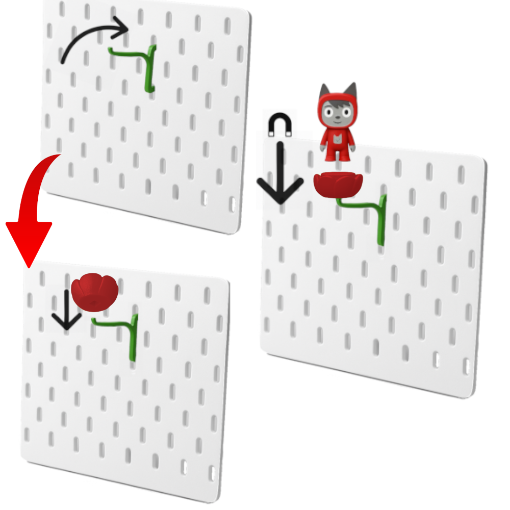 Das Blatt ist präzise 3D-gedruckt und wird auf einen passenden Clip-in-Stängel gesteckt, der sich in Lochwandsysteme wie IKEA Skådis einhängen lässt. So lassen sich Figuren dekorativ, sicher und ordentlich präsentieren – ganz ohne zusätzliches Zubehör.