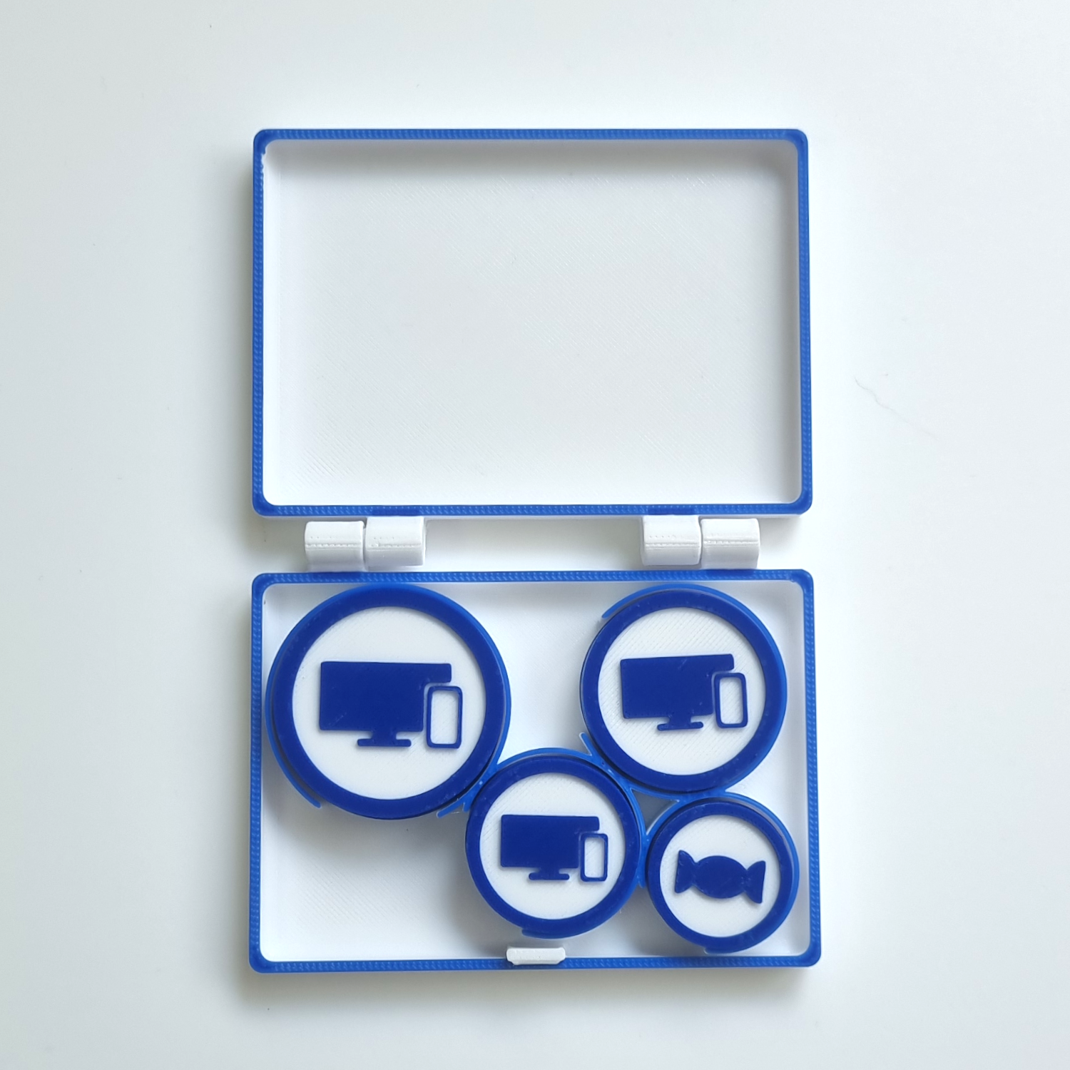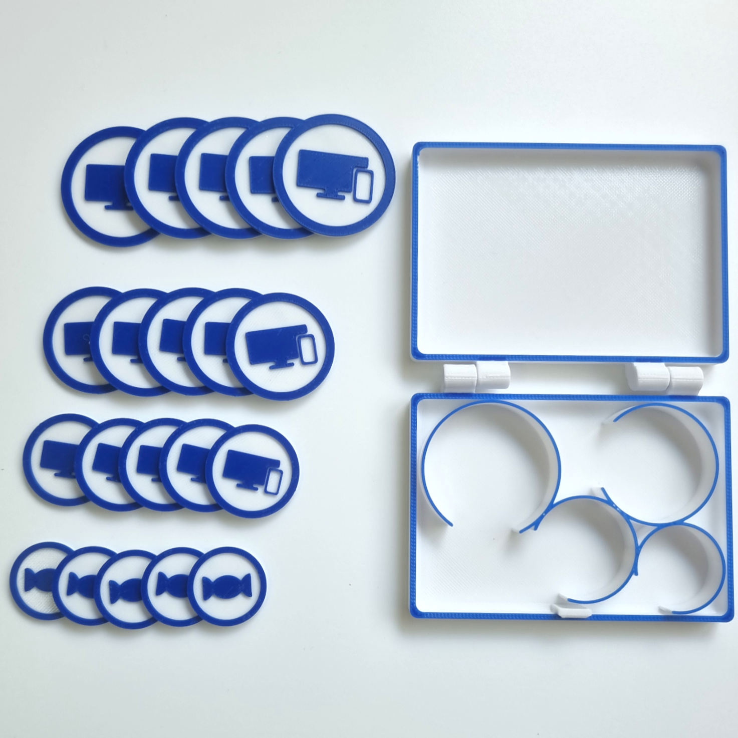 - Handy: 20 Münzen + Aufbewahrungsbox (5x Handy-Münze groß, 5x Handy-Münze mittel, 5x Handy-Münze klein, 5x Handy-Münze groß, Süßigkeiten-Münze)